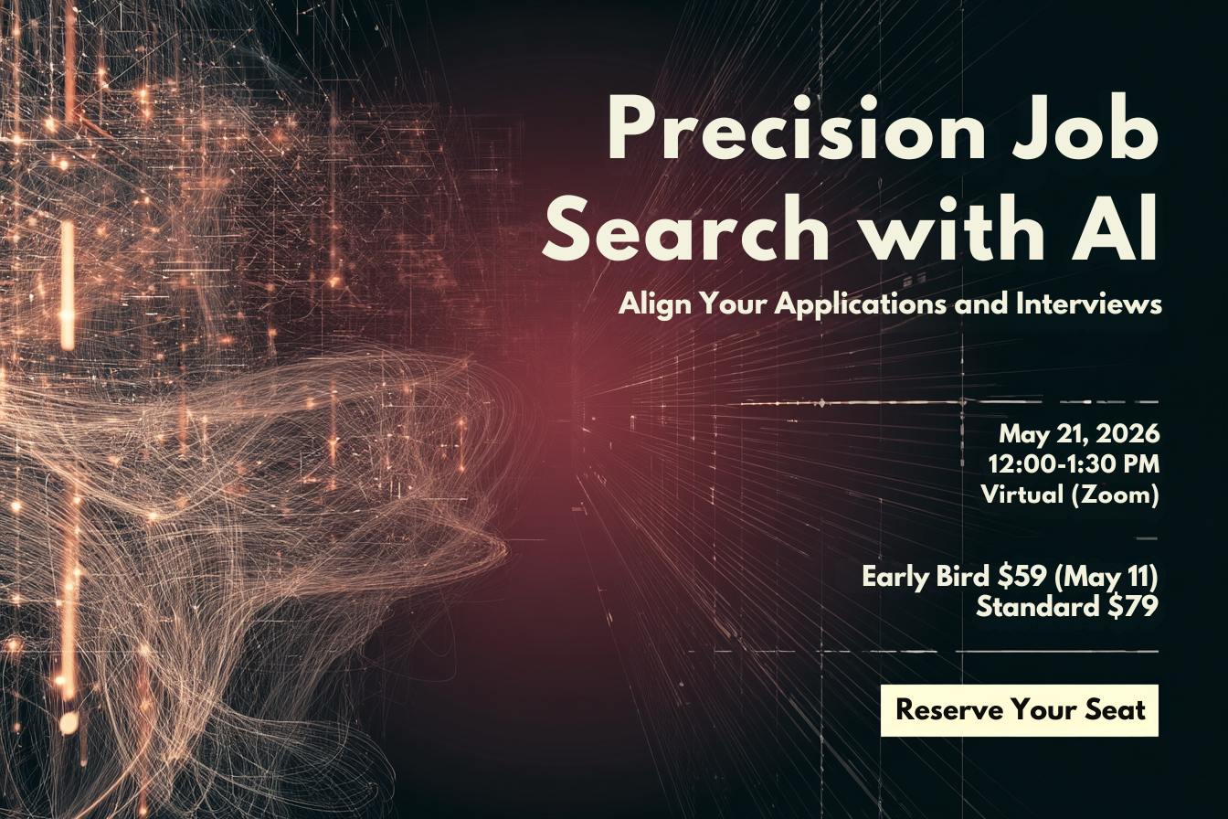 A 90-minute working session to help you analyze job postings, refine your resume, and practice stronger interview responses using proven AI prompts. This session is designed to show you how to approach each stage of the job search using AI. You will see the process in action, understand how to apply it to your own experience, and leave with the exact prompts and structure.